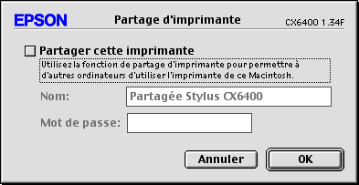 Le paramètre Partage d'imprimante constitue une fonction standard de Mac OS X 10.2 ou plus récent. Cette fonction n'est pas disponible sous Mac OS X 10.1.