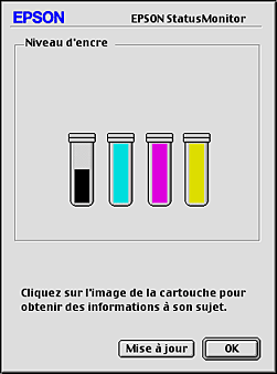 Le graphique affiche la quantité d'encre qui restait lors de la première ouverture de EPSON StatusMonitor. Pour mettre à jour les informations relatives au niveau d'encre, cliquez sur Mise à jour.