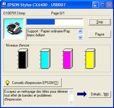 La boîte de dialogue de la barre de progression s'affiche automatiquement lorsque vous envoyez un travail d'impression au combiné multifonction. Elle permet de connaître la quantité d'encre restante.