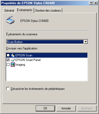 Vous pouvez affecter n'importe quelle application, autre que EPSON Smart Panel, prenant en charge les Événements scanneur (par exemple Imaging pour Windows si cette application est installée) aux touches du panneau de contrôle. Lorsque vous appuyez sur les touches du panneau de contrôle, la boîte de dialogue de EPSON Scan s'ouvre ou la numérisation commence et l'image numérisée est automatiquement envoyée à l'application (qu'il n'est pas nécessaire d'ouvrir manuellement).