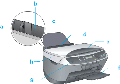 c. Guide papier : soutient le papier chargé dans le bac feuille à feuille.