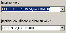 Si la mention EPUSBx : (EPSON Stylus CX6400) apparaît dans la zone de liste Imprimer vers, le pilote d'impression USB et le logiciel d'impression sont correctement installés. Si le port adéquat n'est pas affiché, passez à l'étape suivante.