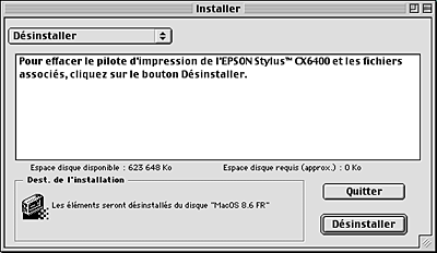 ![]() | Mettez votre Macintosh sous tension et insérez le CD-ROM du logiciel dans le lecteur. Le logiciel d'impression EPSON se lance automatiquement. |