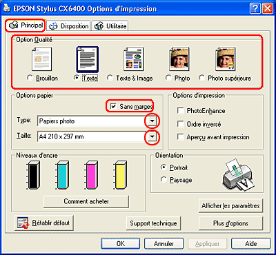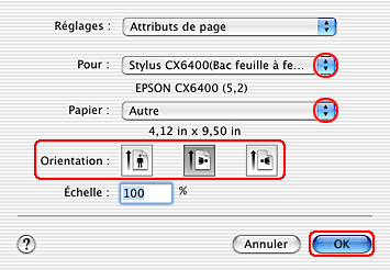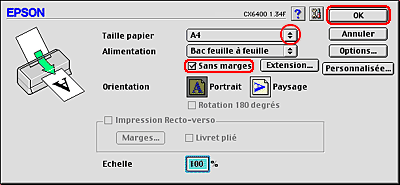 Sélectionnez Stylus CX6400 (bac feuille à feuille - sans marges) pour le paramètre Pour.