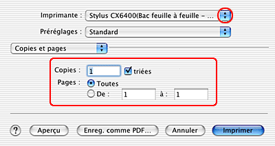 Sélectionnez Stylus CX6400 (bac feuille à feuille - sans marges) pour le paramètre Imprimante, puis réglez les options Copies & Pages.
