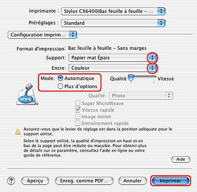 Réglez les paramètres Support, Encre et Mode. Pour plus de détails, consultez l'aide en ligne