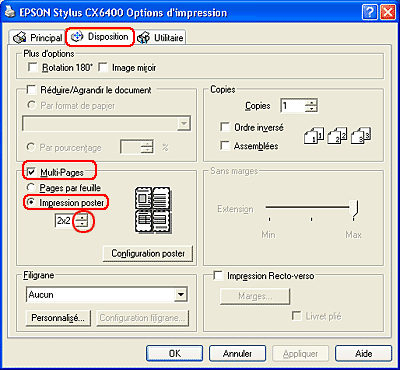 Cliquez sur l'onglet Disposition, puis activez la case à cocher Multi-Pages. Sélectionnez ensuite Impression Poster. Cliquez sur la flèche Haut ou Bas pour sélectionner 2x2, 3x3 ou 4x4.
