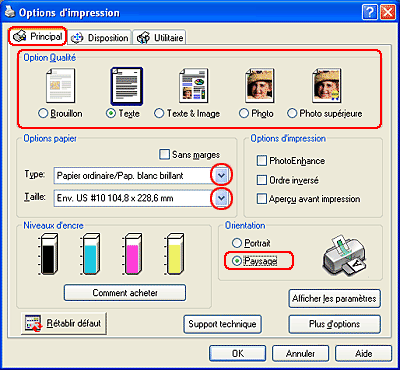 Sélectionnez la taille d'enveloppe appropriée pour le paramètre Papier.