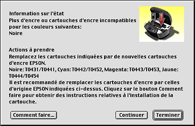 Quand il n'y a presque plus d'encre ou que la cartouche est épuisée, le bouton Comment faire apparaît sous la zone de texte. Cliquez sur Comment faire. L'utilitaire EPSON Status Monitor 3 vous guidera pas à pas tout au long de la procédure de remplacement de la cartouche.