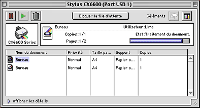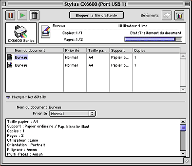 Après l'envoi d'un travail d'impression au combiné multifonction, vous pouvez utiliser l'utilitaire EPSON Monitor IV pour vérifier, annuler ou modifier la priorité des travaux d'impression mis en file d'attente. Cet utilitaire montre aussi l'état du travail en cours d'impression