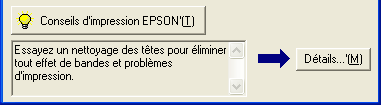 Des conseils pour obtenir les meilleurs résultats de votre logiciel d'impression Epson s'affichent dans la zone de texte au bas de la fenêtre de la barre de progression. Un nouveau conseil apparaît toutes les 30 secondes. Pour avoir plus de détails sur le conseil affiché, cliquez sur le bouton Détails.