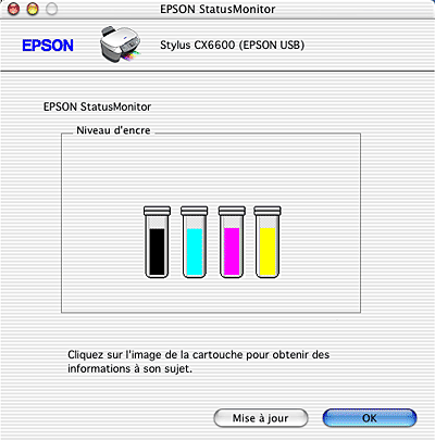 Vous pouvez aussi l'utiliser pour vérifier les niveaux d'encre avant l'impression. Une fois ouvert, EPSON StatusMonitor affiche la quantité d'encre qui restait au moment de son ouverture. Pour mettre à jour les informations relatives au niveau d'encre, cliquez sur Mise à jour.