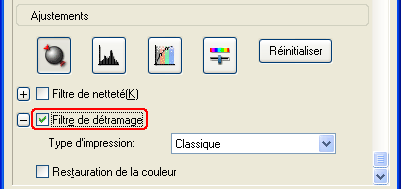 Activez la case à cocher Filtre de détramage dans la zone Ajustements. En Mode loisirs, ouvrez d'abord la boîte de dialogue Ajustements de l'image pour accéder à la case à cocher Filtre de détramage.