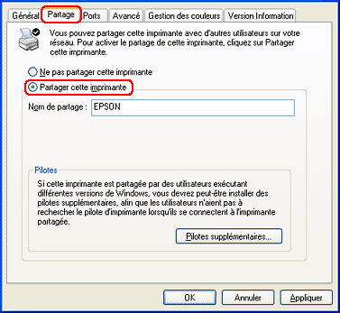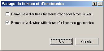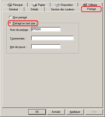 Cliquez sur le bouton Configuration. La boîte de dialogue Partage d'imprimante s'affiche.