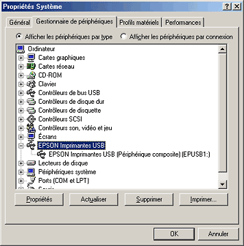 Si les pilotes sont correctement installés, EPSON Imprimantes USB doit apparaître dans le menu Gestionnaire de périphériques.
