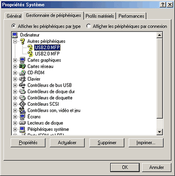 Dans la rubrique Autres périphériques, sélectionnez USB 2.0 MFP ou EPSON Stylus CX6600 puis cliquez sur Supprimer. Cliquez ensuite sur OK.