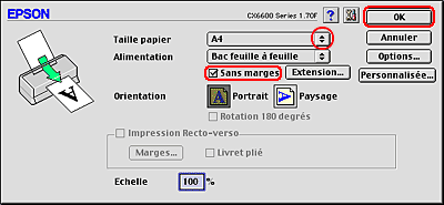 Une fois le support chargé, sélectionnez l'impression sans marge dans les paramètres du pilote d'impression.