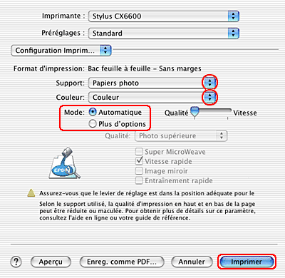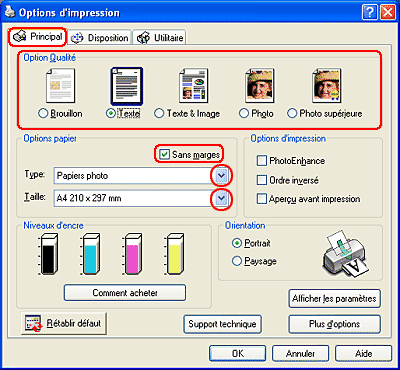 Réglez les paramètres Support, Encre et Mode. Pour plus de détails, consultez l'aide en ligne