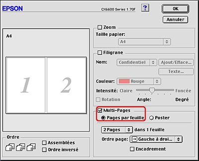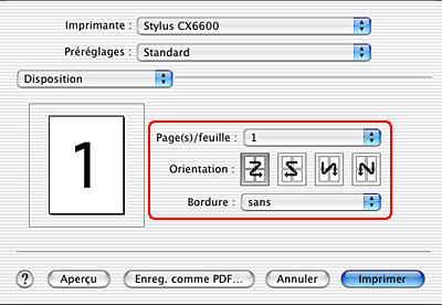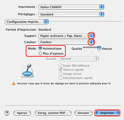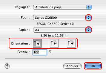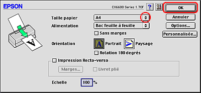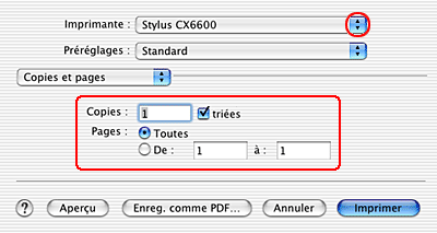 ![]() | Sélectionnez Stylus CX6600 pour le paramètre Imprimante. |