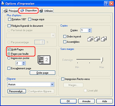 ![]() | Cliquez sur l'onglet Disposition, puis activez la case à cocher Multi-Pages. Sélectionnez ensuite Pages par feuille. |