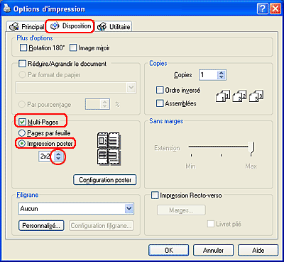 Cliquez sur l'onglet Disposition, puis activez la case à cocher Multi-Pages. Sélectionnez ensuite Impression Poster. Cliquez sur la flèche Haut ou Bas pour sélectionner 2x2, 3x3 ou 4x4.