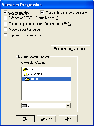 Vous pouvez augmenter la vitesse d'impression en sélectionnant certains paramètres de la fenêtre Vitesse & Progression. Cliquez sur le bouton Vitesse et Progression de la fenêtre Utilitaire du pilote d'impression.