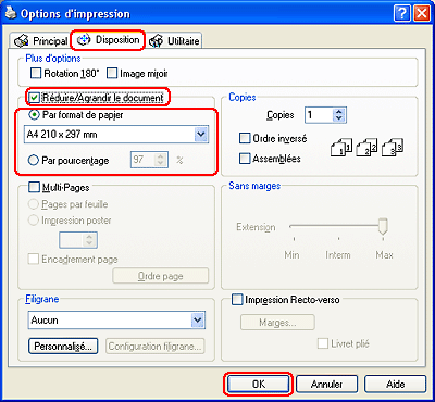 Cette fonction n’est pas disponible dans le cadre de l'impression sans marges.