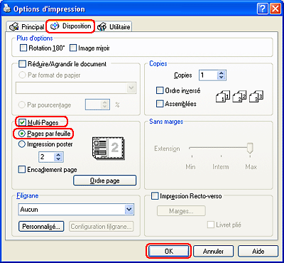 Cliquez sur l’onglet Disposition, sélectionnez Multi-Pages, puis Pages par feuille.