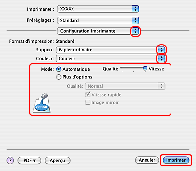 Sélectionnez les paramètres Support, Couleur et Mode adaptés. Pour plus de détails sur l’option Configuration Imprimante, reportez-vous à l’aide en ligne.