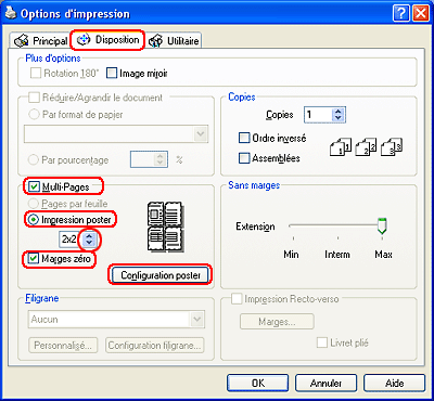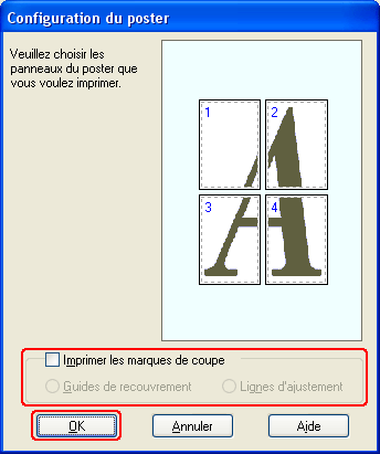 L’impression Poster permet d’imprimer une image à la taille d’un poster en agrandissant le document de façon à couvrir plusieurs feuilles de papier.