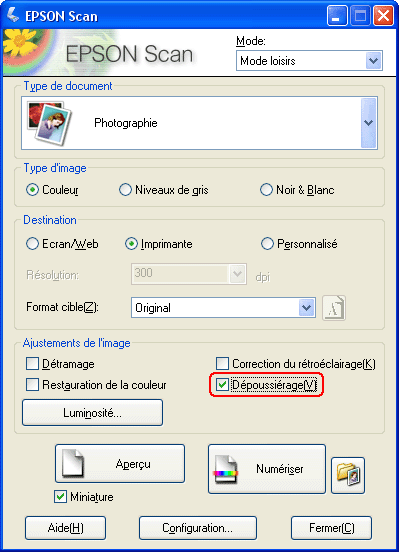 La fonction Dépoussiérage de Epson Scan vous permet de supprimer virtuellement les traces de poussière des documents originaux lors de la numérisation.
