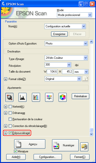 Procédez comme suit pour supprimer les traces de poussière à l'aide de Epson Scan.
