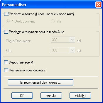 Le Mode auto est le plus adapté lors de la numérisation de documents ou de photos au format original et lorsque vous ne souhaitez pas afficher les images en aperçu avant de procéder à la numérisation. Pour restaurer les couleurs passées ou supprimer les traces de poussière, cliquez sur le bouton Personnaliser.