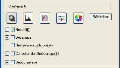 Avant de procéder aux ajustements, veillez à cliquer sur l'image ou la zone de cadrage de la zone que vous souhaitez ajuster. En Mode Professionnel, il est possible que vous deviez faire défiler la fenêtre pour atteindre la zone Ajustements de la fenêtre principale de Epson Scan.