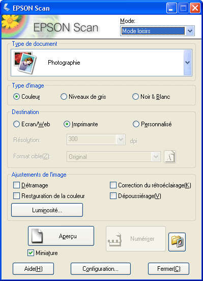 Le Mode loisirs est le plus adapté lorsque vous souhaitez les images des photos en aperçu avant de procéder à la numérisation. Vous pouvez modifier la taille de l'image lors de la numérisation, ajuster la zone de numérisation ainsi que de nombreux paramètres de l'image, incluant la restauration de la couleur, le dépoussiérage et la correction du rétroéclairage.
