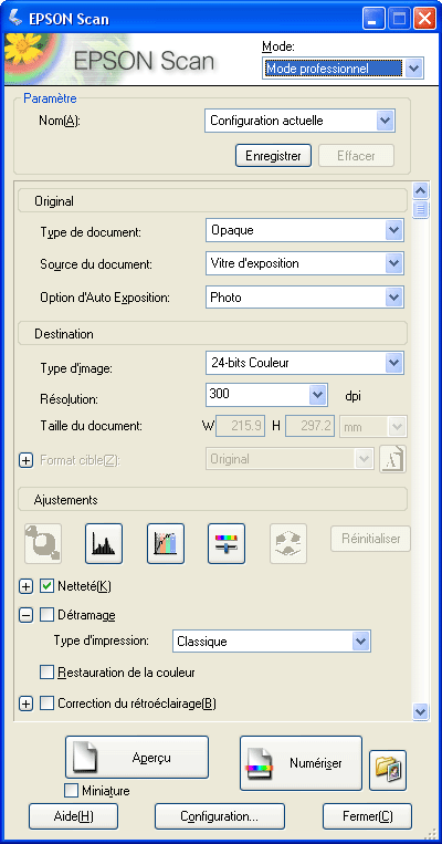 Le Mode professionnel est le plus adapté lorsque vous souhaitez afficher l'image en aperçu et apporter des corrections nombreuses et détaillées au niveau de l'image avant de procéder à la numérisation. Vous pouvez augmenter la netteté, corriger les couleurs et optimiser l'image à l'aide d'une gamme complète d'outils, incluant la restauration de la couleur, le dépoussiérage et la correction du rétroéclairage.