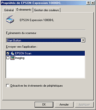 Si vous avez besoin de désactiver l'option Événements scanneur, cochez la case Désactiver les événements de périphériques dans la boîte de dialogue Propriétés du scanner.