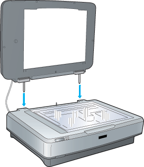 Alignez les broches du lecteur sur les orifices du scanner. Abaissez ensuite le lecteur de manière à ce qu'il soit correctement placé sur le scanner (les broches doivent se trouver dans les orifices).