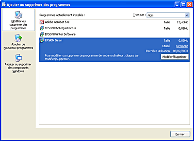 ![]() | Sélectionnez EPSON Scan dans la liste, puis cliquez sur Modifier/Supprimer (Windows XP, 2000 ou NT 4.0) ou sur Ajouter/supprimer (Windows Me ou 98). |