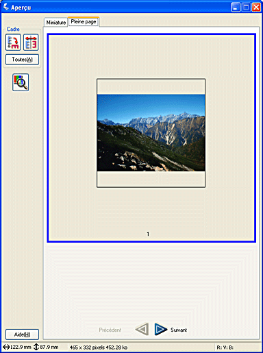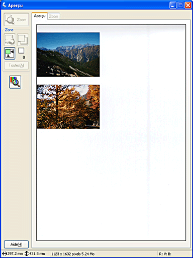 La méthode Aperçu normal vous permet de voir l'aperçu de l'image dans son entier et les effets des paramètres que vous avez définis, et de procéder à des ajustements supplémentaires de l'image. Vous pouvez aussi utiliser des zones de cadrage pour numériser des portions d'image sélectionnées. Pour plus de détails sur les zones de cadrage, reportez-vous à la section Utilisation de zones de cadrage.