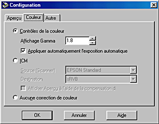 Choisissez dans cette boîte de liste un profil de couleur pour le scanner que vous utilisez. EPSON recommande de sélectionner EPSON Standard pour tout scanner EPSON.