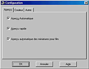 Cliquez sur le bouton Configuration dans la fenêtre du mode Manuel pour ouvrir la boîte de dialogue de même nom dans laquelle vous pouvez régler toute une gamme de paramètres liés à la fenêtre d'aperçu et à l'image en aperçu, et effectuer un réglage des couleurs.