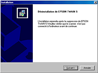 Vous pouvez aussi désinstaller EPSON TWAIN à partir de la boîte de dialogue EPSON Installation Program. Pour afficher la boîte de dialogue, insérez le CD-ROM du logiciel du scanner dans le lecteur.