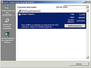 Pour désinstaller EPSON TWAIN, procédez comme suit. Pour les utilisateurs de Windows Me ou 98, reportez-vous à la section Pour les utilisateurs de Windows Me ou 98. Pour les utilisateurs de Windows 2000, reportez-vous à la section Utilisateurs de Windows 2000.