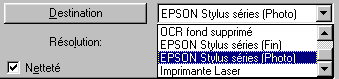 Si vous souhaitez imprimer des images numérisées sur une imprimante EPSON Stylus après avoir choisi l'option Economie, Normal - 360dpi ou Fin - 360dpi pour le paramètre Qualité d'impression dans votre logiciel d'impression, il est recommandé de sélectionner l'option Imprimante EPSON Stylus (Fin). Si vous souhaitez imprimer après avoir choisi l'option Photo - 720dpi ou Photo - 1440dpi pour le paramètre Qualité d'impression, sélectionnez Imprimante EPSON Stylus (Photo).
