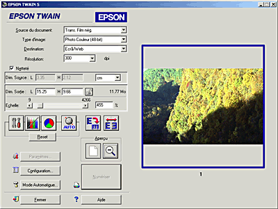 Si la case Aperçu automatique de la boîte de dialogue Configuration est cochée, un aperçu de l'image s'affiche automatiquement après le démarrage de EPSON TWAIN. Reportez-vous à la section Paramètres de configuration.