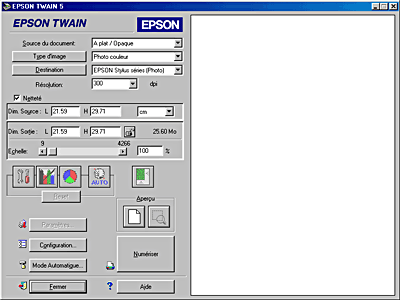 Numérisation de l'image ou de la zone de cadrage sélectionnée dans la fenêtre d'aperçu. Reportez-vous à la section Utilisation du bouton Numériser. |