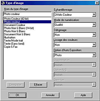 Pour supprimer une configuration de Type d'image, sélectionnez son nom dans la liste Type d'image, puis cliquez sur Effacer.