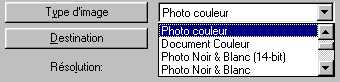 Lorsque l'option sélectionnée pour le champ Source du document est Trans. Film nég. Monochrome, ou lorsque l'aperçu des miniatures est activé, seules les options Photo couleur et Photo Noir & Blanc sont disponibles dans la liste Type d'image.