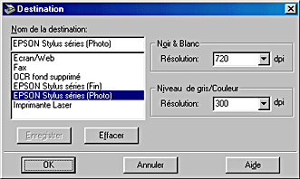 Si vous souhaitez imprimer des images numérisées sur une imprimante EPSON Stylus après avoir choisi l'option Economie, Normal - 360dpi ou Fin - 360dpi pour le paramètre Qualité d'impression dans votre logiciel d'impression, il est recommandé de sélectionner l'option Imprimante EPSON Stylus (Fin). Si vous souhaitez imprimer après avoir choisi l'option Photo - 720dpi ou Photo - 1440dpi pour le paramètre Qualité d'impression, sélectionnez Imprimante EPSON Stylus (Photo).